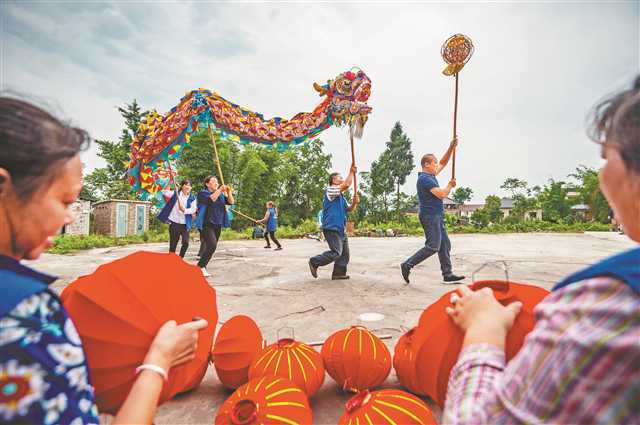 銅梁區太平鎮坪漆村龍燈彩扎基地,村民正在體驗舞龍,感受銅梁龍的魅力。 (攝于5月26日)