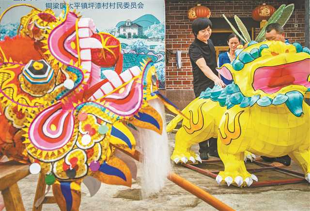 銅梁區太平鎮坪漆村龍燈彩扎基地,村民正在學習龍燈彩扎制作工藝,通過制作龍燈、燈籠等增收致富。
