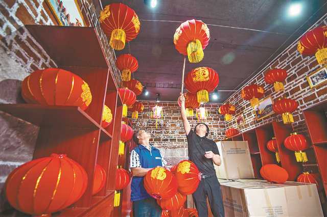 銅梁區太平鎮坪漆村龍燈彩扎基地,周建(右)和周光學(左)正在檢查制作好的燈籠是否達標。55歲的周光學是坪漆村的村民,跟著周建學習龍燈彩扎手藝,去年在家門口務工就增收6000多元。