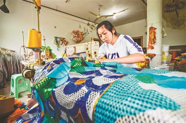 5月25日,銅梁區太平鎮新藝龍燈制品彩扎廠,周建的女兒正在進行龍燈龍身布料制作。